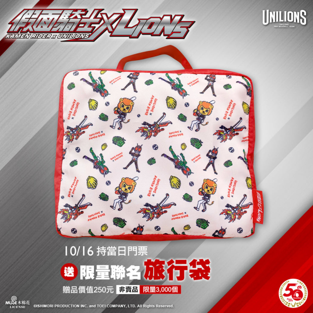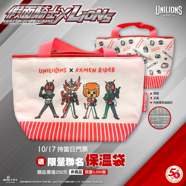 另外,購票入場觀賽的朋友,也可以獲得由統一獅與本次聯名的《假面騎士 W》、《假面騎士 BLACK》與《假面騎士聖刃》的旅行袋與保溫袋,兩場次分別贈送不同的贈品,想要收藏的朋友,兩場都不能錯過唷 XD。