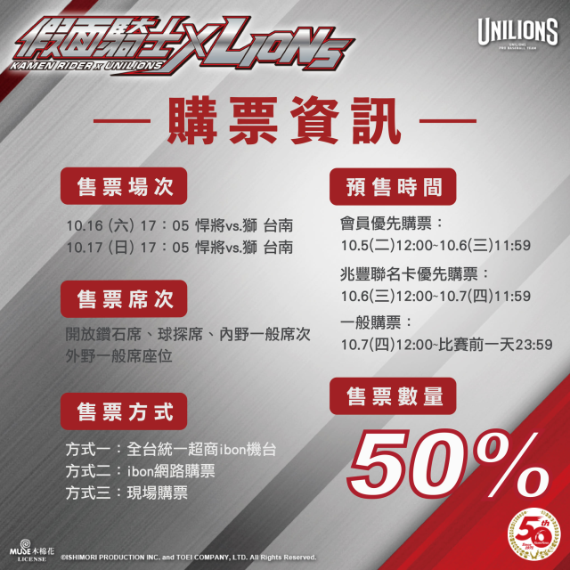 目前官方尚未公布聯名球衣等各種周邊商品的販售資訊 ( 不過球衣樣式在官方宣傳圖已有球員穿著的圖像 ),如有後續資訊公開本篇文章也會替各位更新。不論你是統一獅還是《假面騎士》的粉絲,千萬別錯過這次的主題日活動,一年一度的機會值得前往,一同和假面騎士聲援統一獅捍衛台南主場 !