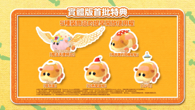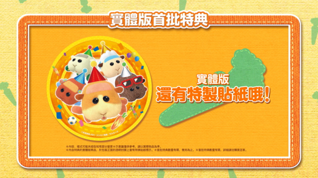 目前台灣也已經公布了銷售資訊,確定本款將有中文化,不用擔心語言問題啦 ! 並公開了實體版首波預約特典,將會有 5 種裝飾品的提早開放使用權,更可以額外獲得《PUI PUI 天竺鼠車車 一起來!天竺鼠車車派對!》特製貼紙。