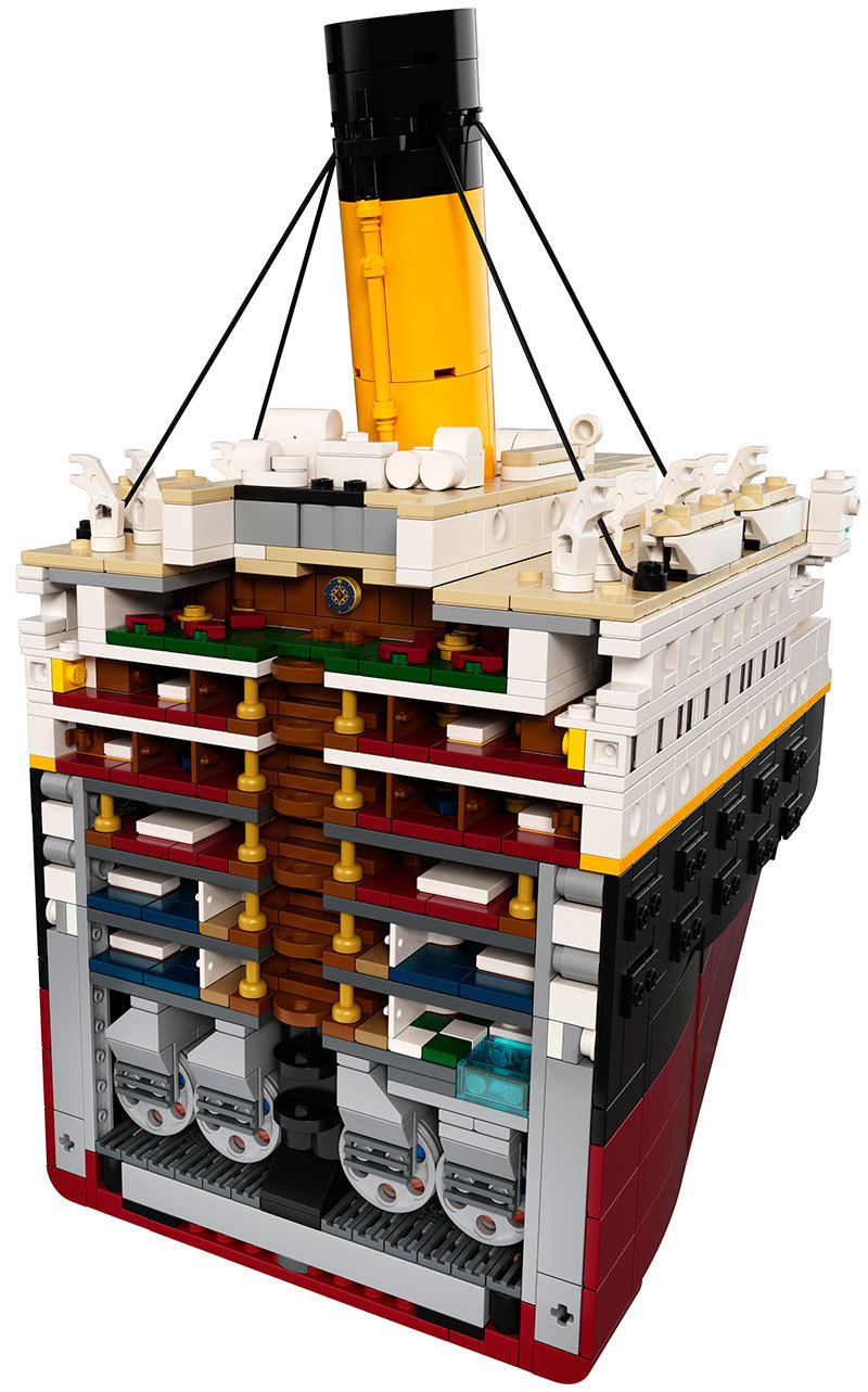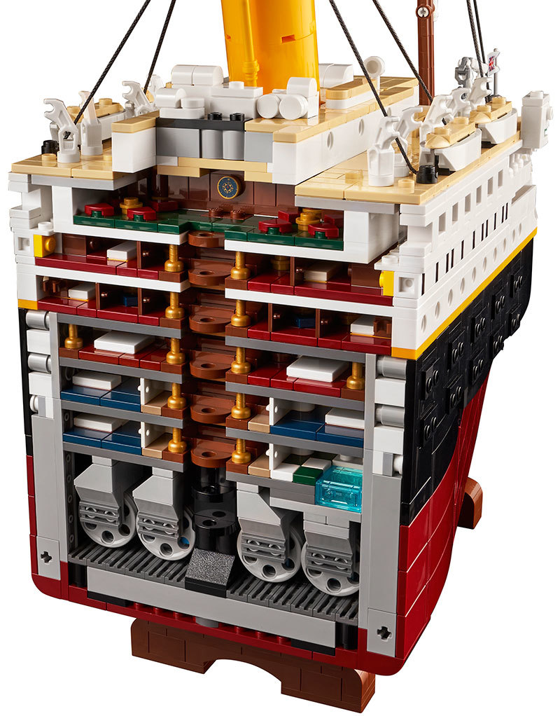 除了上層的甲板之外,像是餐廳、主樓梯、鍋爐室......等內裝細節則能夠藉由三段式船體的設計來好好感受,看著整齊排列的零件實在療癒!當然展示部分也沒有馬虎,樂高打造出了一個仿木質感的支架,能讓你穩穩停靠這艘奧林匹克級郵輪,加上「TITANIC」的名牌,超級豪華!不過,這款樂高究竟要放哪絕對也是值得各位玩具人好好思考的問題XD~
