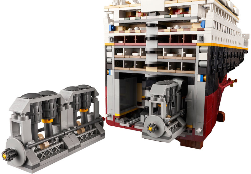 這次的「樂高鐵達尼號」一共用上 9090 片零件,光看零件數量的話僅次於「31203 世界地圖」的 11695 片,並且比「10276 羅馬競技場」的 9036 片多一些,但 135 公分的長度基本上就堪稱史上最大級樂高了!整體充分還原了這艘傳奇英國皇家郵輪的黑白紅主調與巨大的金黃色煙囪,船體線條考究地再現,並搭載可轉動螺旋槳、下錨靠岸這些把玩驚喜。