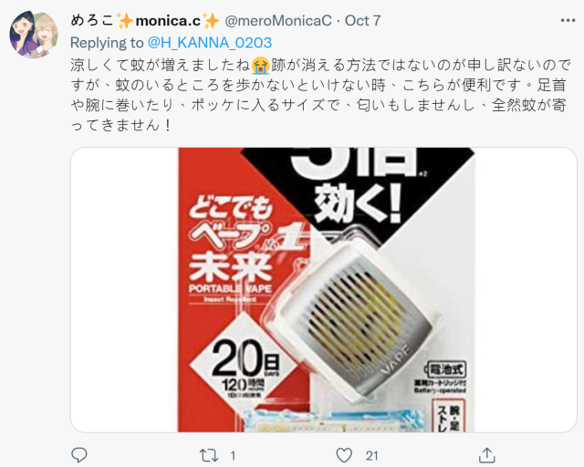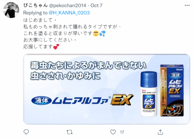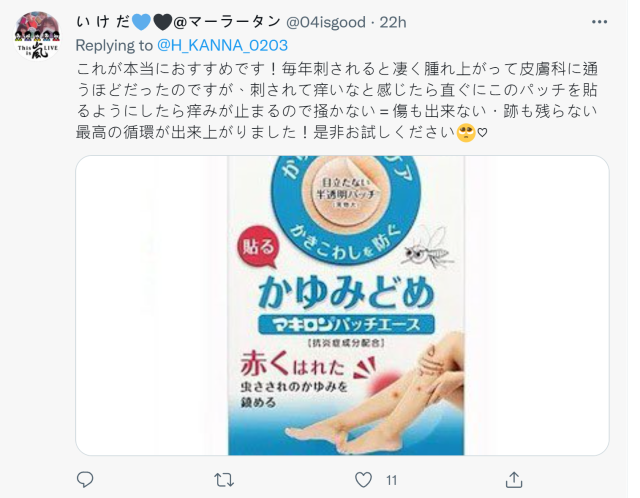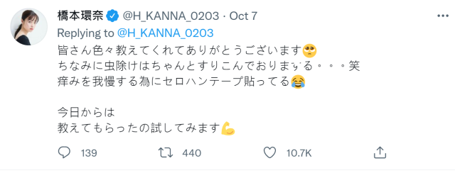 不到一天就湧入數百則的回覆,橋本在看過大家的留言後非常感謝,使用除蟲劑什麼的也會嘗試,自己還因為這樣貼了遮醜的透氣貼布。會嘗試大家給予的意見,會試著嘗試各種辦法的。