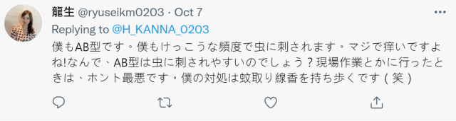 在昨天的發布的推文中,表示自己 9 月以來就常常被蚊子叮咬,已經嘗試用各種方法解決,不過還是希望能有辦法快速消除叮咬的痕跡,透漏自己是 AB 型的,覺得這樣身體有點醜 QQ。