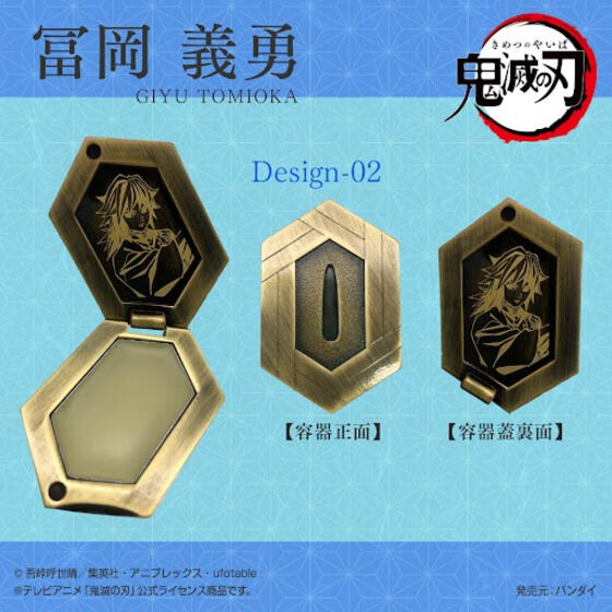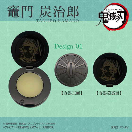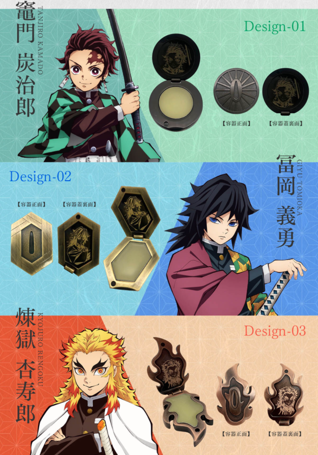《鬼滅之刃》日輪刀刀鍔造型保濕霜採用三款人物-竈門炭治郎、富岡義勇與煉獄杏壽郎所持有的日輪刀刀鍔為靈感,設計出保濕霜的外盒,透過特殊的造型展現出有別於一般化妝品的樣貌。盒子打開後有著人物的圖像藏在裏頭。