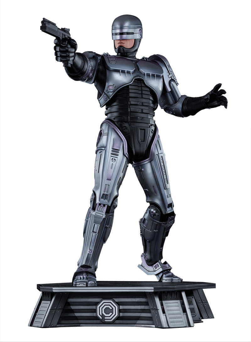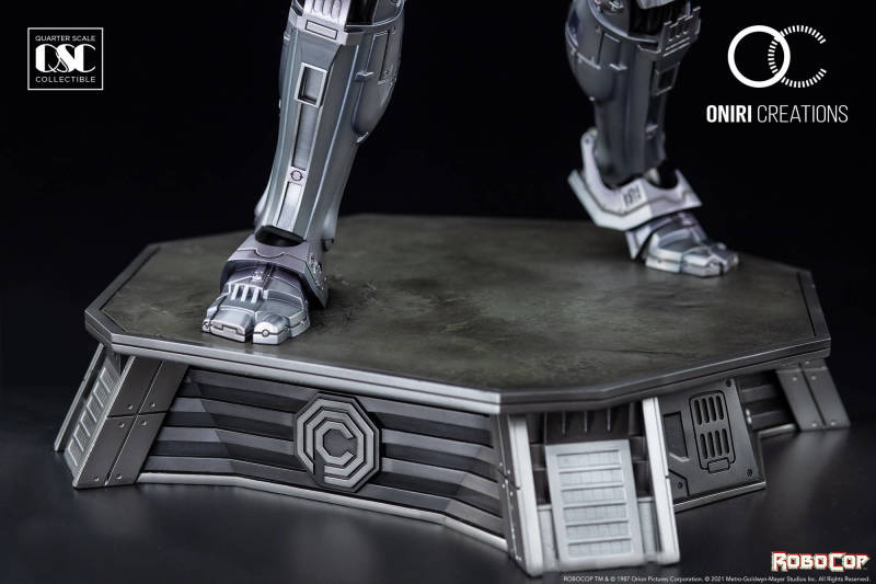 金屬裝甲身軀施以手繪紫藍色塗裝,還原劇中獨特的金屬色澤。從機械細節、著名的 Auto-9 手槍的啞光黑色,每一種材料都經過精心重新製作,以打造終極機械戰警雕像。另外,底座部分則是以 OCP 的機器工廠為設計,除了有公司LOGO,也設計因機器戰警重量而龜裂的地面等細節!