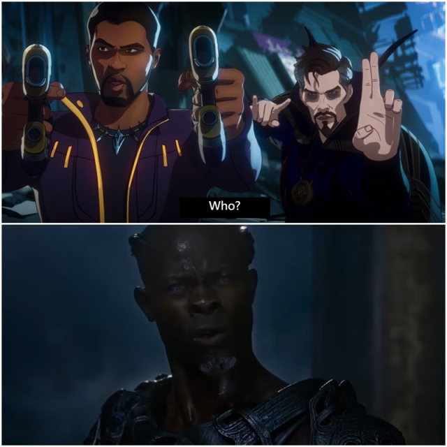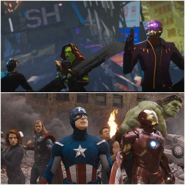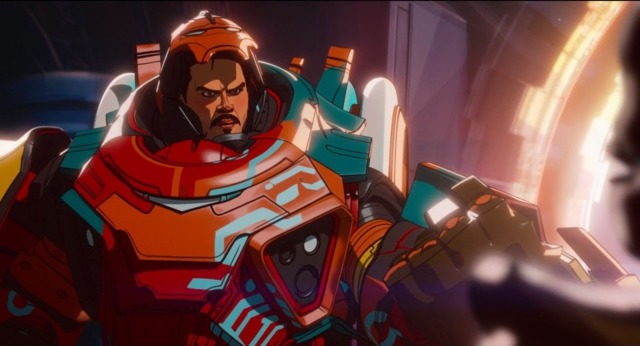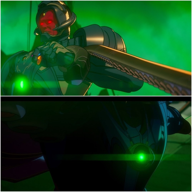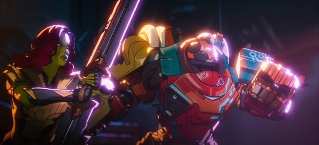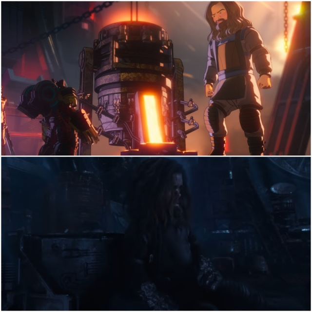 接著我們來到一個「陌生」的宇宙看到東尼史塔克和葛摩拉,正在尼達維利爾溶解無限手套。這個橋段原本會是第一季的其中一集,只是因為疫情讓預算壓縮,所以把這集挪到下一季。講述東尼史塔克因某種原因漂流到薩卡星上成為角鬥士,而葛摩拉在競技場上戰勝自己的養父薩諾斯。也可以在這裡注意到史塔克的戰甲上,有著薩卡星風格的圖騰。