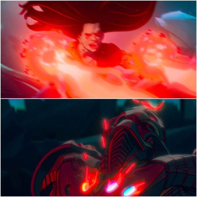 至尊奇異博士用傳送門將喪屍大軍活埋奧創,但真正的目的是傳送喪屍緋紅女巫,她用混沌魔法暫時將奧創困住,但是一樣不敵無限寶石。值得注意的細節是,無限寶石似乎吸收了緋紅女巫的能力,而非只是抑制住。