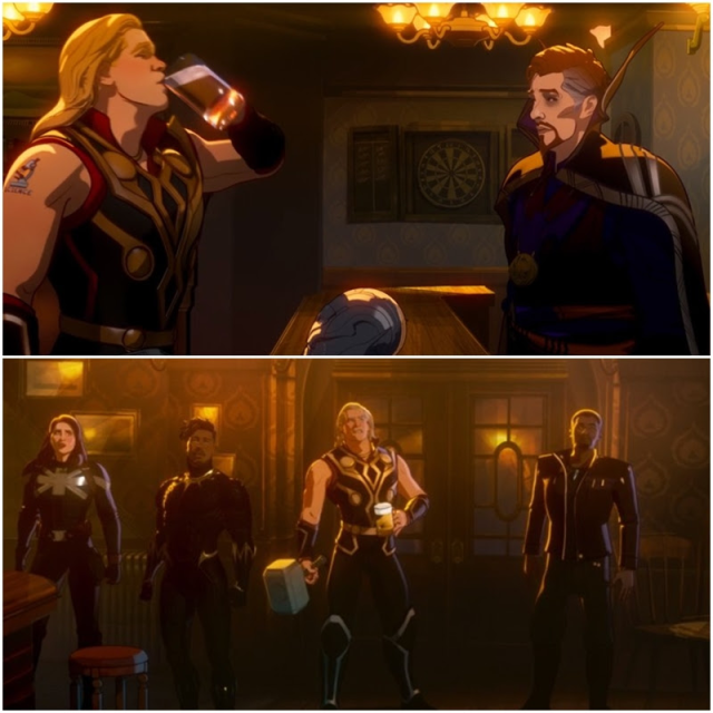 索爾和奇異博士要了一杯啤酒來喝,下一幕居然又是滿的了。這也是在玩《雷神索爾:諸神黃昏》中兩人初次相遇的魔法啤酒橋段。