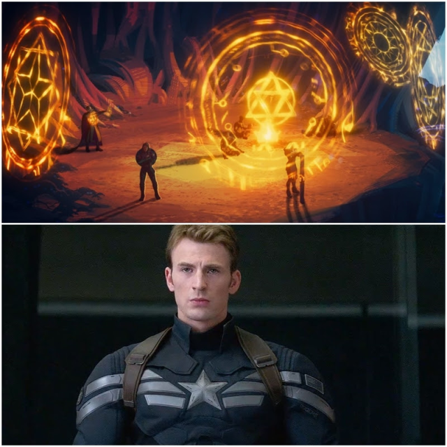 至尊奇異博士給所有人不同造型的魔法護盾,其中可以看到佩姬卡特的護法造型,是對應史帝夫的星星標誌。而索爾身上的魔法防護罩則是他在漫畫中的經典神話造型。