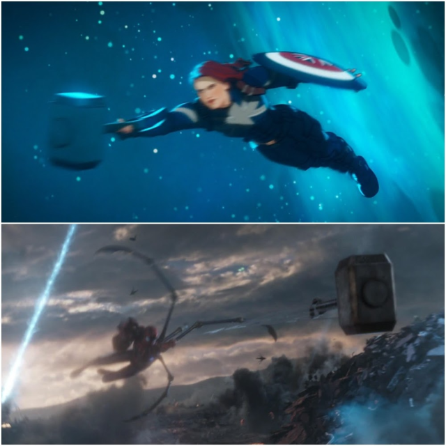 佩姬卡特在至尊奇異博士支援下攻擊奧創,並抓住雷神槌以回到地面。而在《復仇者聯盟:終局之戰》中蜘蛛人也用過這個招式運送無限手套。