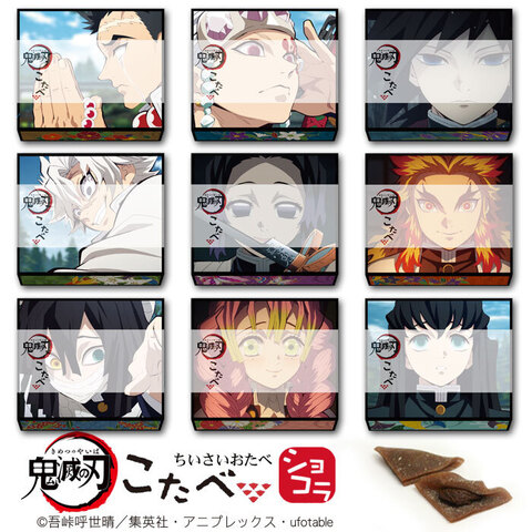 這次推出以《鬼滅之刃》鬼殺隊「九柱」為主題,推出了九位角色的限定包裝樣式 「KOTABE (こたべ) 」 。而在先前就推出過了竈門炭治郎、禰豆子、我妻善逸、嘴平伊之助、産屋敷耀哉與鬼舞辻無慘的圖案樣式。每一盒裡面都有著五個 KOTABE,目前官方推出紅豆、抹茶、栗子、紫番薯與限定的巧克力口味。