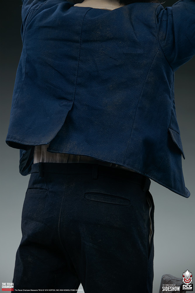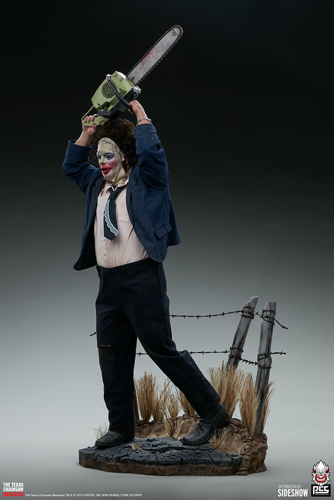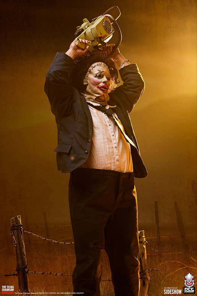 本作高約 83 公分,根據電影末段「皮臉」讓女主角「莎莉」逃走,憤而在大馬路上狂舞的場景為題,再現了巨漢殺人魔身穿西裝、戴上 Pretty Woman 面具的驚悚造型,肥壯的軀體、高舉電鋸的雙臂、蓬鬆亂髮,以及底座上歪七扭八的護欄、乾草,充分帶出劇中情境,而在服裝部分則是採用複合式材料的方式製作,還原劇中設定的同時也為這尊雕像增添真實感,面具上的可怕妝容、從縫隙中可見的雙下巴、被割傷的腿部......這些細節也考究地製作出來。