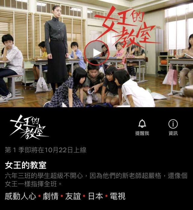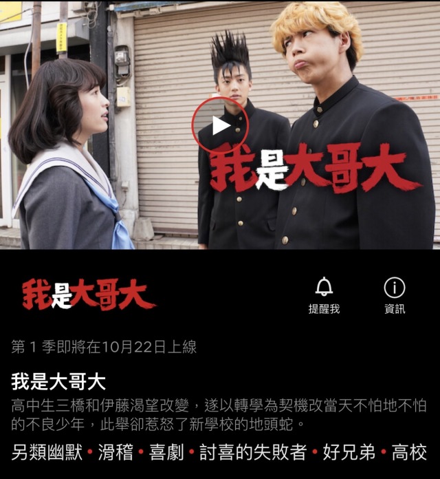 而在2006年由天海祐希所主演的經典日劇《女王的教室》,與由福田雄一在2018執導的漫改喜劇《我是大哥大!!》,則是在2021年10月22日上架;另外同樣由福田雄一導演,並為室剛、永野芽郁主演的《寵女青春白皮書》(又譯:《寵女傻瓜》)為2021年10月29日播映。