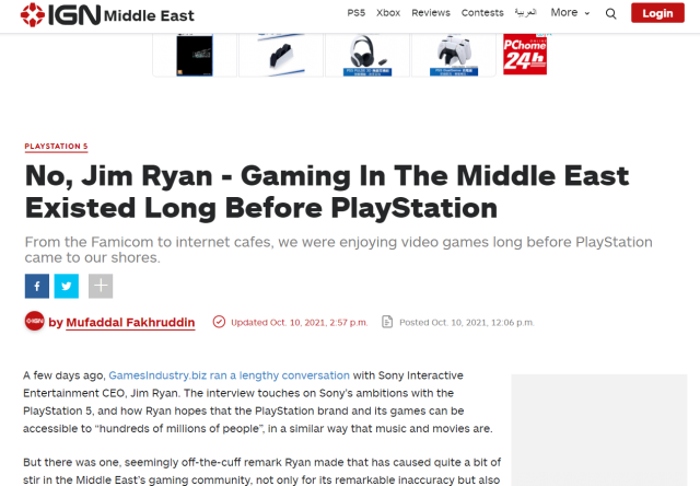 然而,中東地區並非如SIE總裁所說得如此「落後」,其中中東網友محمد محمود الشريف(@Meghterb)在Twitter上反駁表示,在80年代以來,中東國家與電玩文化的淵源並不淺,不僅是經歷過一度輝煌的雅達利時代,更也玩過任天堂美版紅白機Nintendo Entertainment System(簡寫NES)、Sega Genesis等遊戲,對此對於Jim Ryan所說的「未曾玩過電玩」簡直就是謬論。