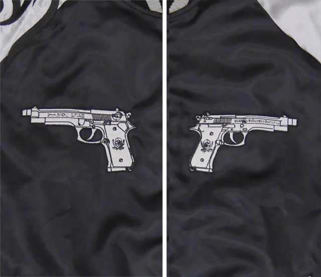 外套以高技術的刺繡工藝呈現,正面胸前兩把手槍為主體,右肩處以女主角蕾威的刺青圖案為設計,並在背後放上大面積的 Black Lagoon 商會刺繡,巨大的骷髏配上雙刀,呈現出氣勢逼人的黑幫氣息。