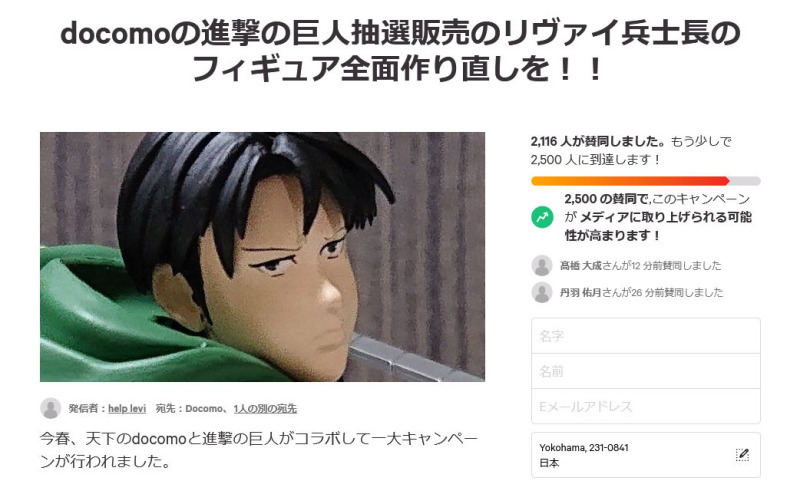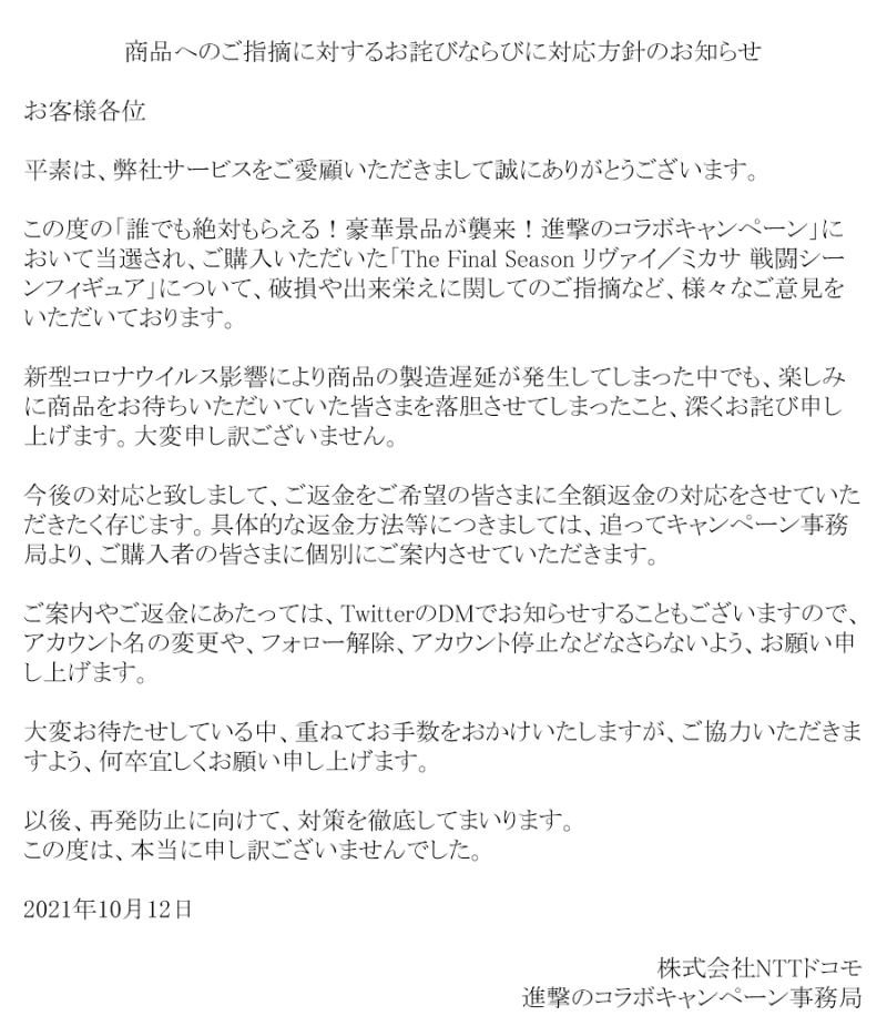日本電信公司 NTT docomo 於 2021 年 02 月 15 日~03 月 21 日期間曾與大人氣漫畫《進擊的巨人》展開合作,推出能獲得角色聲音、聲優簽名等多種獎項的抽獎活動,甚至還能獲得「米卡莎」、「里維」角色模型的購買權。然而模型出貨後卻看見消費者滿滿的抱怨與災情,讓 docomo 不得不發佈公告謝罪並全額退費。