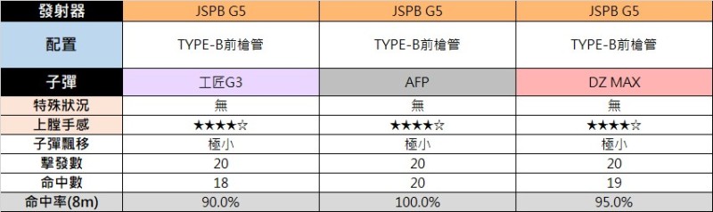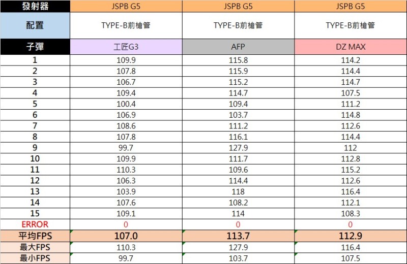 三種子彈的數據差不多,平均FPS都在110左右,上下限的浮動很小,表現穩定。順帶一提,MK2打工匠G3的平均FPS為117.9、AFP為130.5。