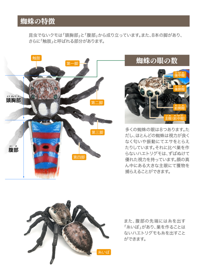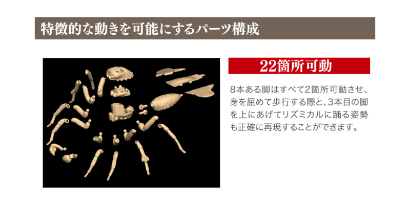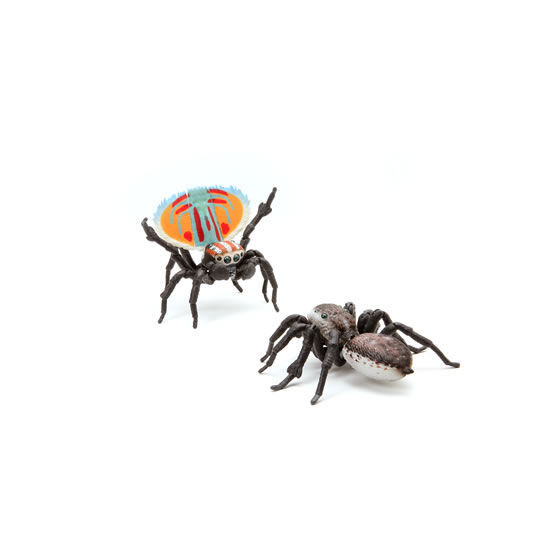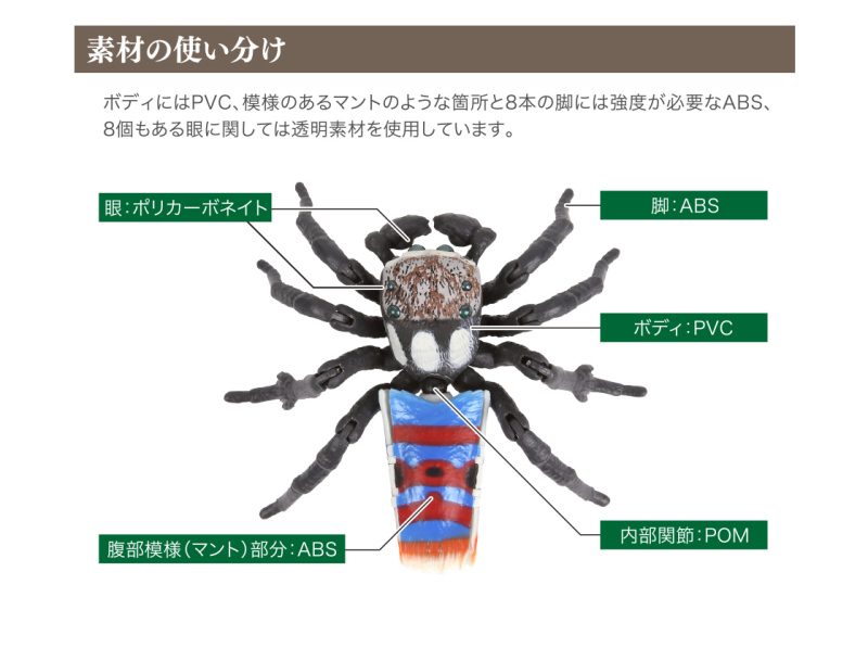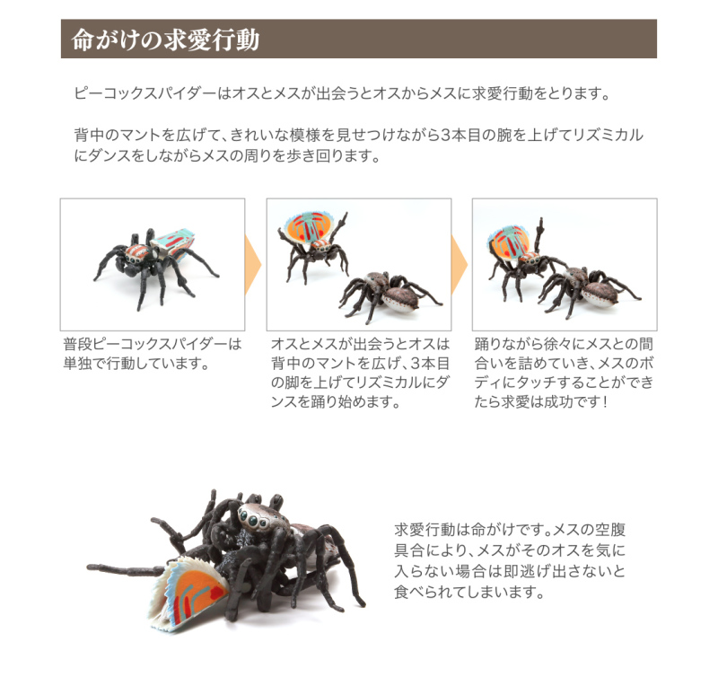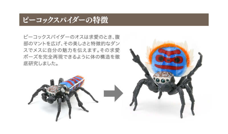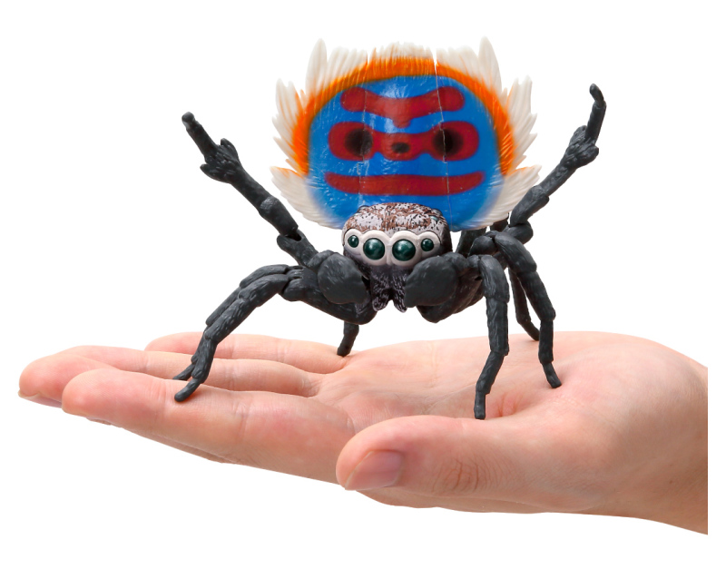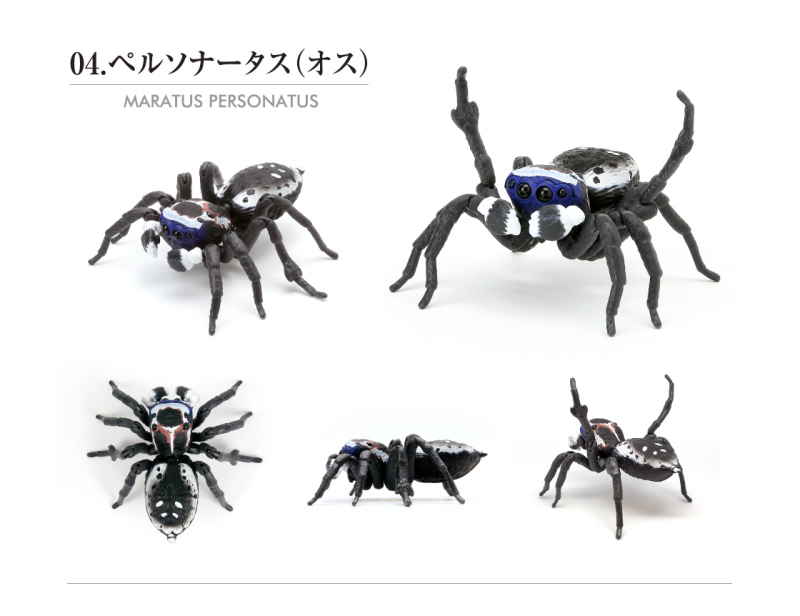 「GASHAPON 孔雀蜘蛛」,以放大 2000 %、全長 10 公分大尺寸打造,推出五款色彩鮮艷、會開屏大跳求偶舞的超人氣孔雀蜘蛛:Speciosus(雄)、Lobatus(雄)、Borane(雄)、Persona(雄)以及Borane(雌),全身達 22 處可動設計,徹底還原孔雀蜘蛛的身體結構,毛茸茸的步足、八個單眼等精緻的生物構造,並真實再現能夠舉起手手、抬高展示其美麗腹部的求偶舞造型!艷麗的特徵花紋、塗裝栩栩如生!