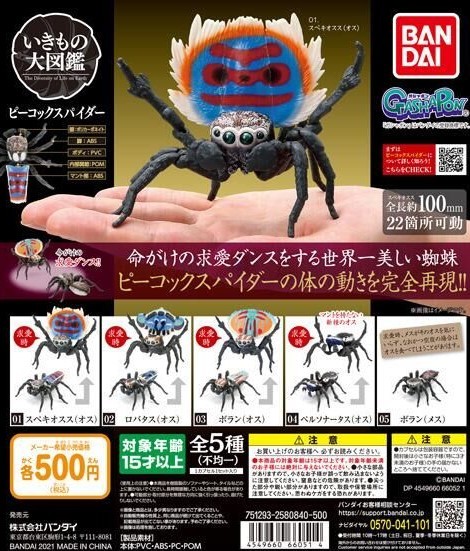日本萬代玩具公司轉蛋事業部 GASHAPON 旗下高人氣的超擬真的無殼環保轉蛋,又將推出全新的生物大圖鑑-蜘蛛第一彈「孔雀蜘蛛(ピーコックスパイダー)」轉蛋,共有五種款式,每轉參考售價為 500 日圓,預計將於 2021 年 10 月第五週強勢登場!
