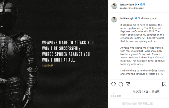 對此,在「疫苗風波」報導刊登後的數日,莉蒂西亞·萊特在她的Instagram上針對該事件出面反駁,她說:「我不得不出現澄清對於《好萊塢報導》在10月6日所報導,對於我在《黑豹2》(Black Panther: Wakanda Forever)拍攝片場的行為,恕我直言,我必須說這是不實報導。」