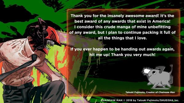 另外,本次哈維獎有另一個獲獎的作品,就是由藤本樹所創作的人氣漫畫《鏈鋸人》榮獲本屆最佳漫畫獎。目前第一部公安篇已完結的鏈鋸人,能受到這樣的榮譽,藤本樹老師也非常開心。 雖然自己認為偏血腥暴力的作品在這種獎項比較劣勢,但能獲獎也是莫大的榮幸。