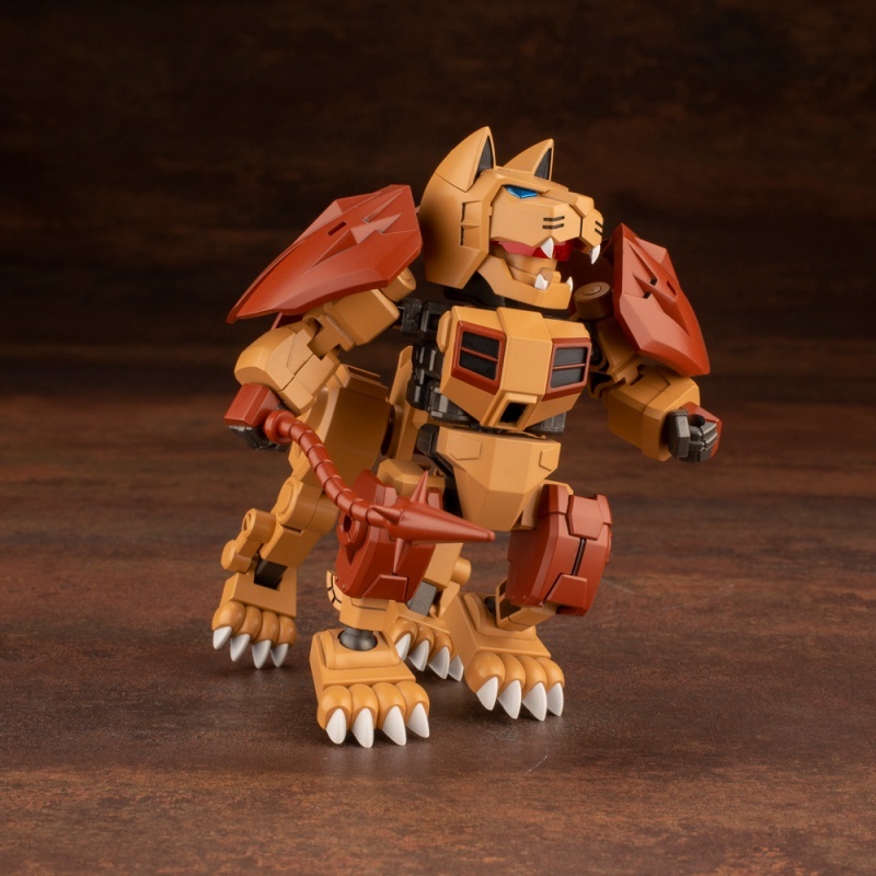 此次推出的是 EVOBEAST 軍團的戰士「F-GAO-G1 皇吼」,套件具備橘色、紅色、槍鐵色、透明紅、透明藍等五種成形色,採用共通規格的 3mm 卡榫與核心區塊,簡易組裝即可再現機器人形態與變形後的獅子形態。更能運用同系列的其他機體、壽屋推出的 M.S.G、骨裝機兵、六角機牙...等 3mm 卡榫模型互相替換零件進行改造!