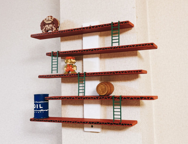 推主ミキ(@miki800)最近在IKEA買了能固定在牆上的層板架「LUSTIGT」,內容物就是五片層板和附屬的小梯子,而作者也利用這個層板架來打造遊戲中的關卡場景,從把層板上色到放置遊戲中的梯子、木桶和鐵桶,然後將小瑪利歐和大金剛放上去就完成了遊戲中第一關的場景。