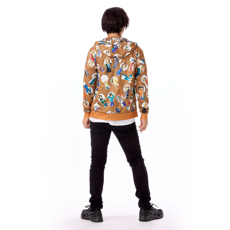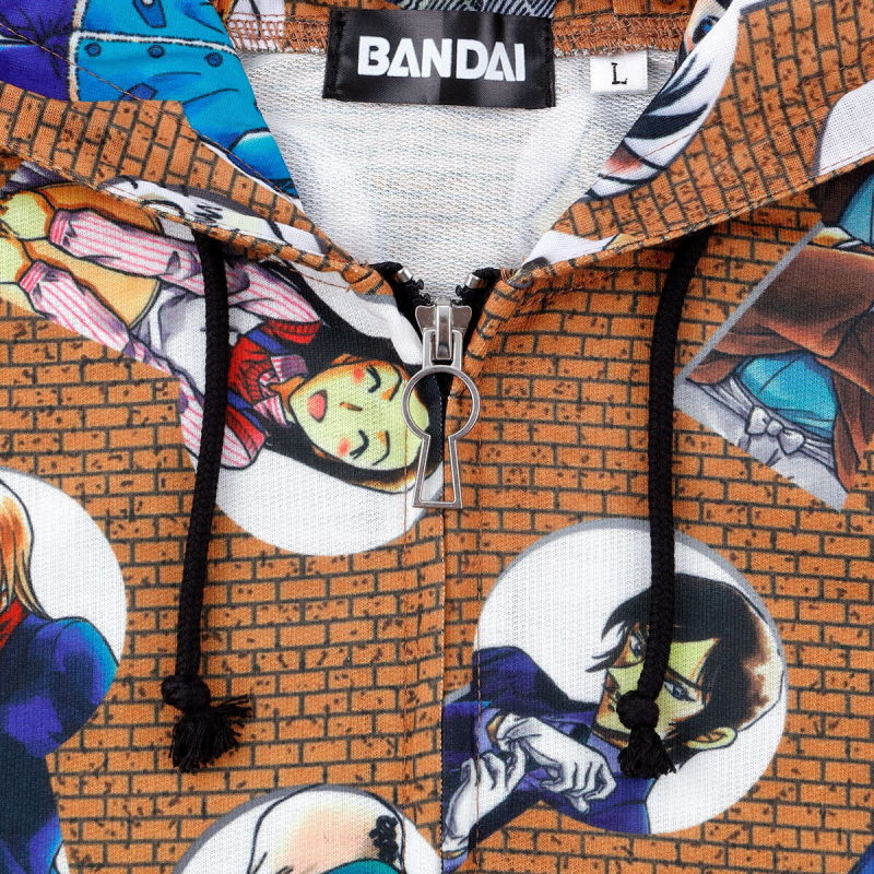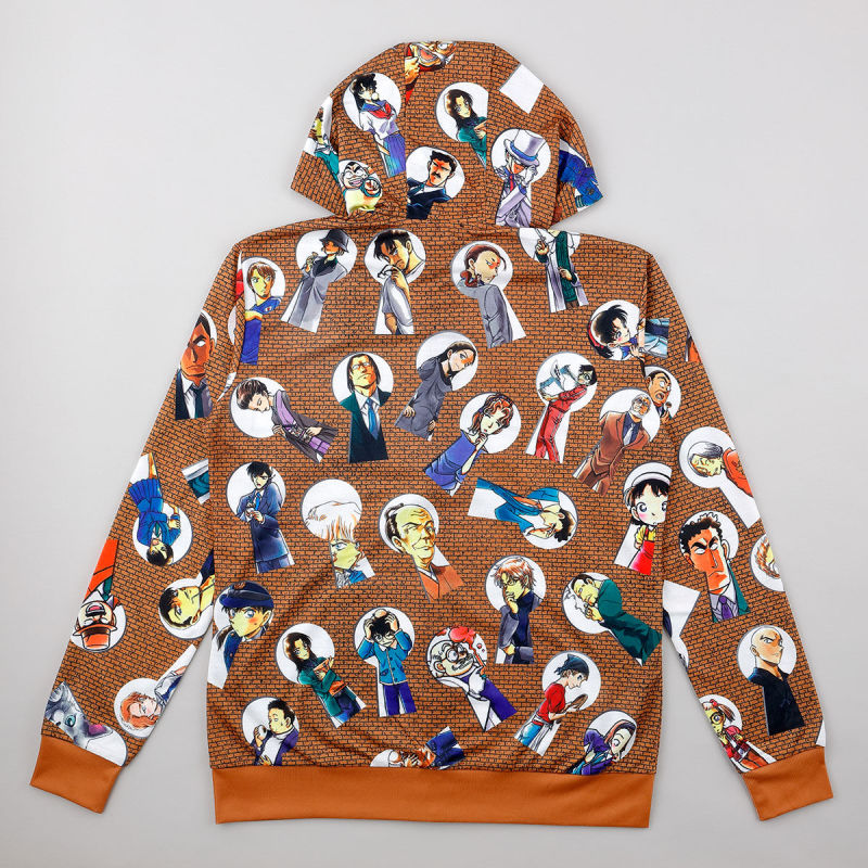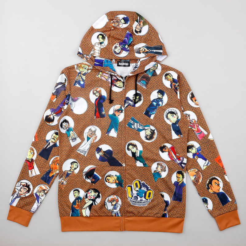 其中推出的「名偵探柯南 100集紀念連帽外套」,以漫畫封面標誌性的石磚牆、鑰匙孔作為設計,精選了 99 位粉絲們熟悉、懷舊的劇中角色,一口氣全部放到連帽外套的圖樣上(真是相當直接的設計阿)!除了拉鍊的也以鑰匙孔為造型之外,在左側口袋還放上了 100 集企劃的紀念LOGO。雖然整體花色有些聳動,但充滿柯南世界觀的設計,對粉絲來說也是別具紀念意義吧~