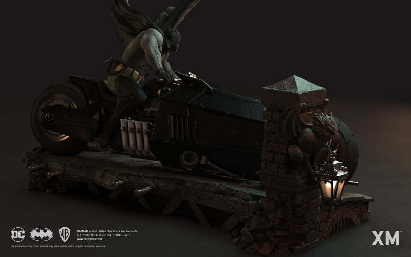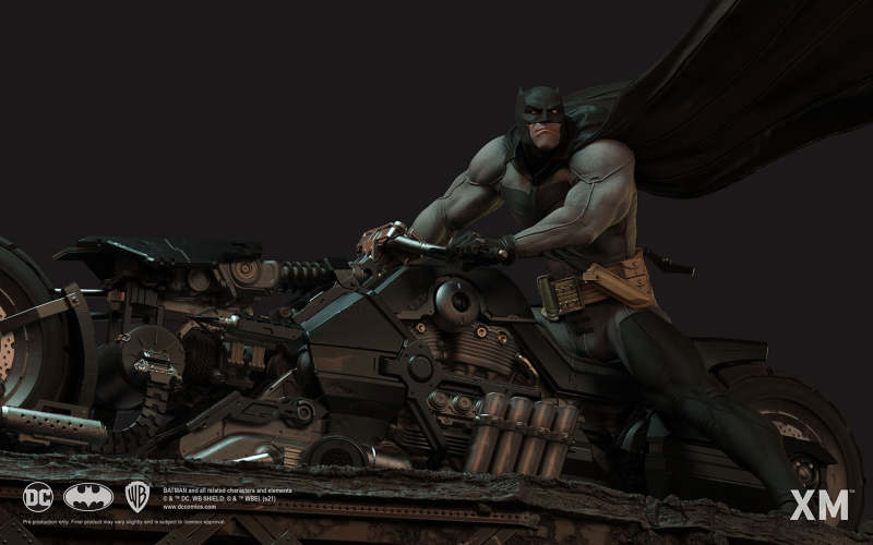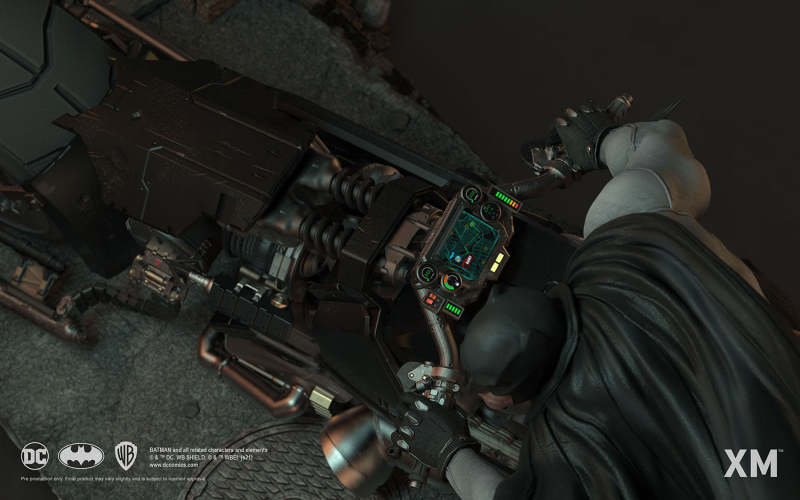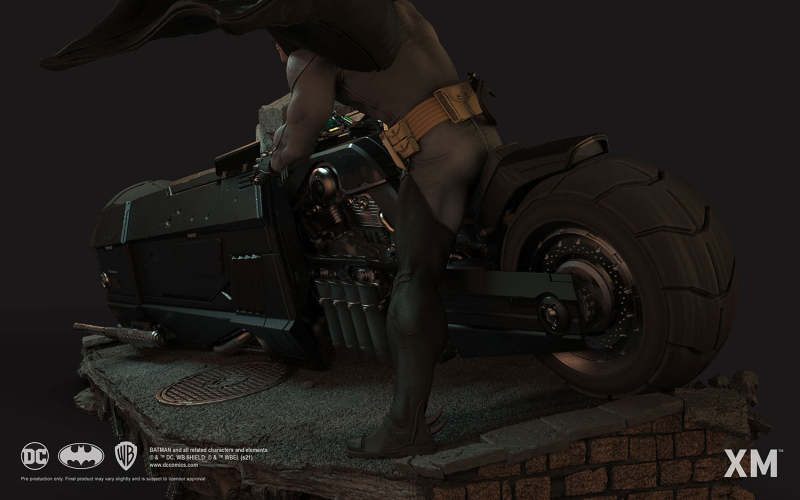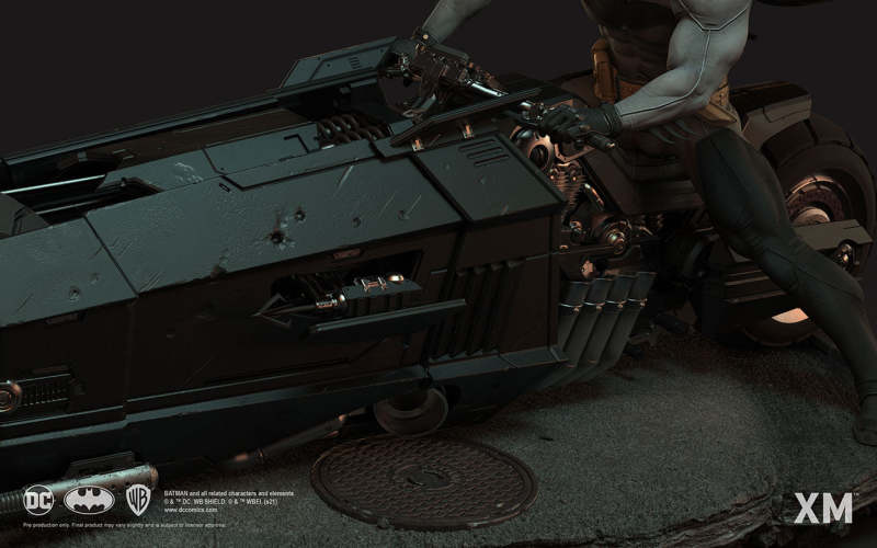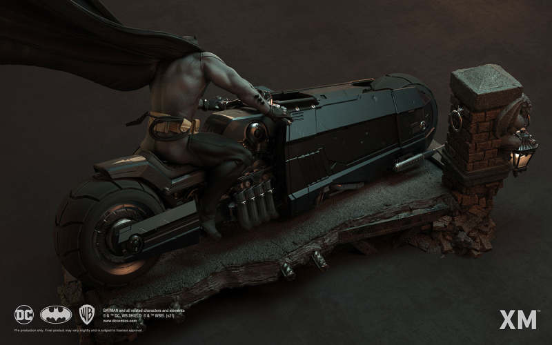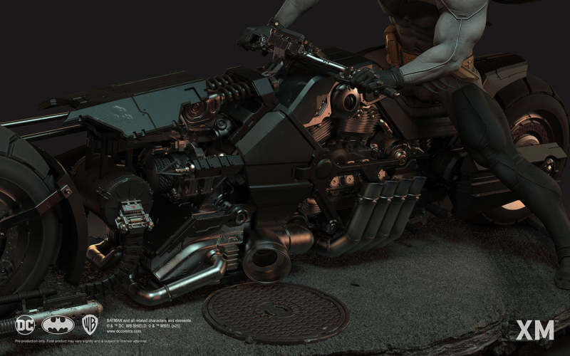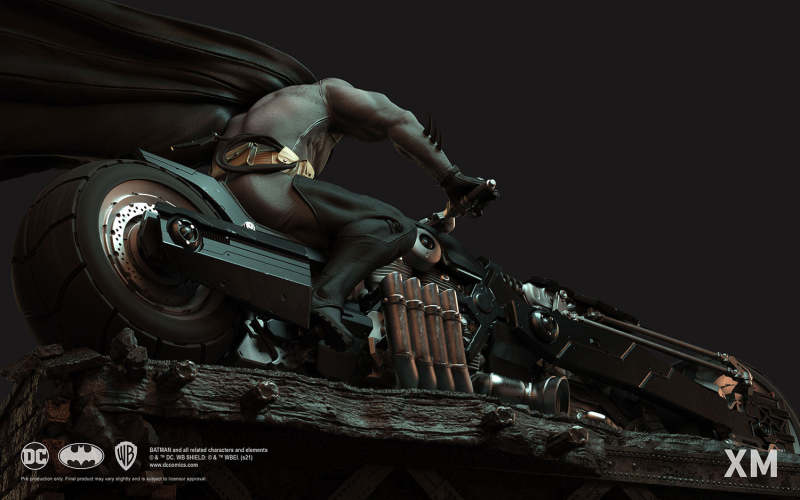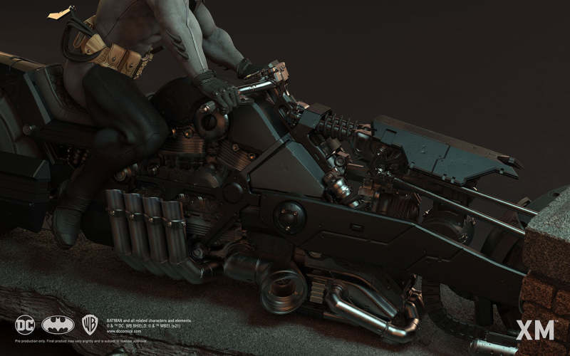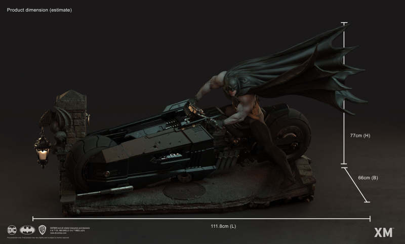 本作是由 XM Studios 與創作《蝙蝠俠:白色騎士》的漫畫家 Sean Murphy 攜手打造,長度來到驚人的 111.8 公分,整體展現出騎著蝙蝠機車的蝙蝠俠在道路上急煞調頭的場景,飛舞的披風、機車在地面上畫出的胎痕有著強烈速度感,蝙蝠俠本體考究地還原漫畫設定的蝙蝠裝,並形塑出寫實的肌肉線條,蝙蝠機車的部分更是令人興奮!除了再現其獨特、俐落的線條,與彈孔、刮痕這些戰損處理之外,還能藉著拆下前蓋、欣賞到漫畫中看不到的內裝機構,驚喜滿載!