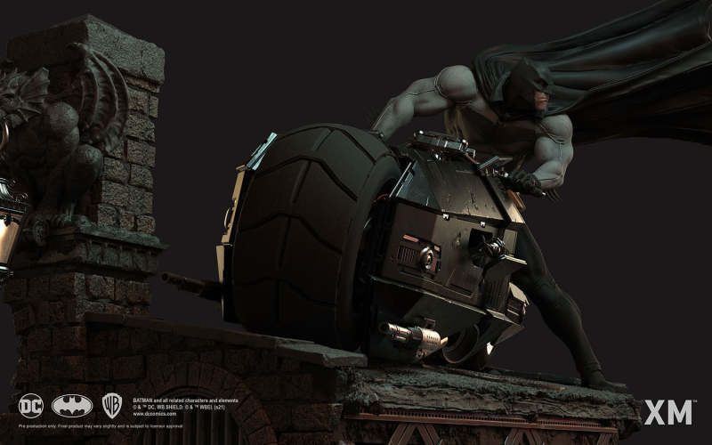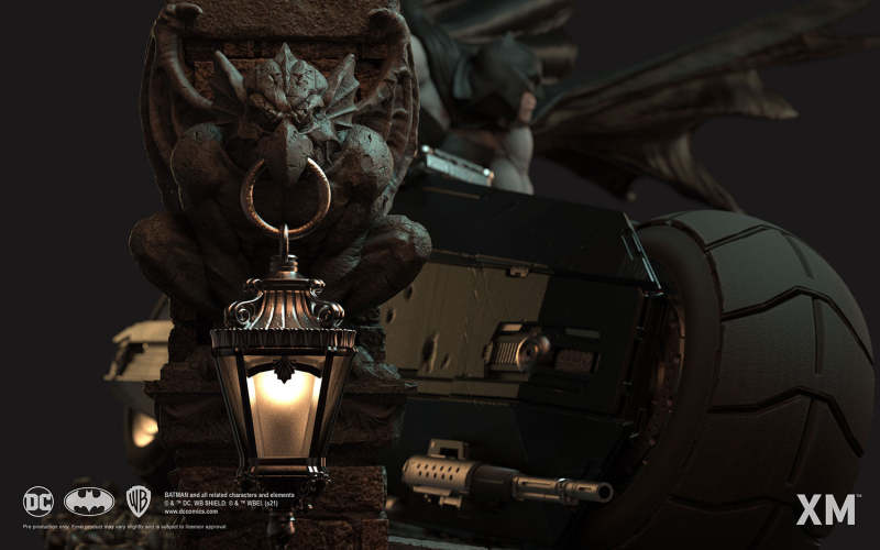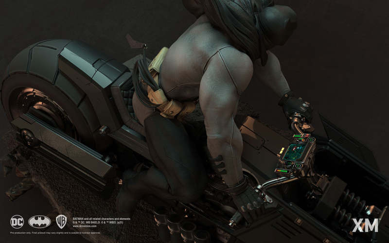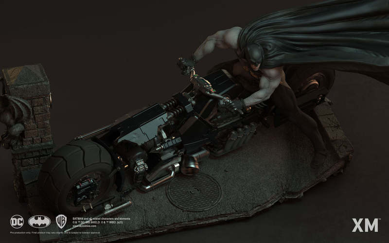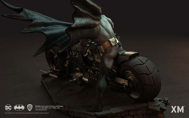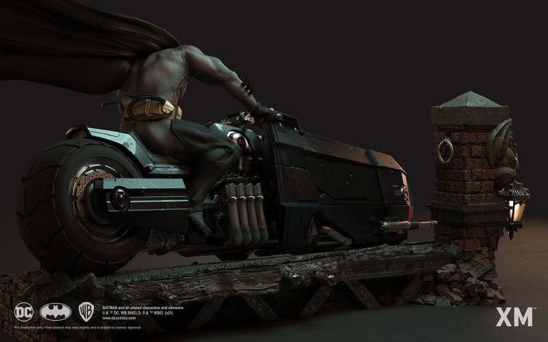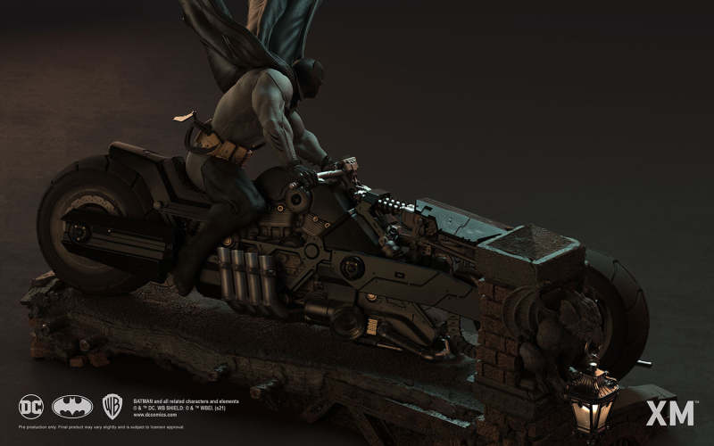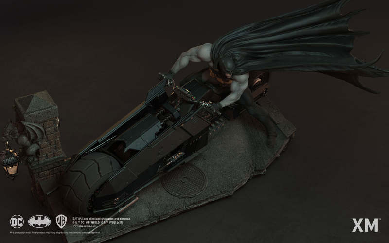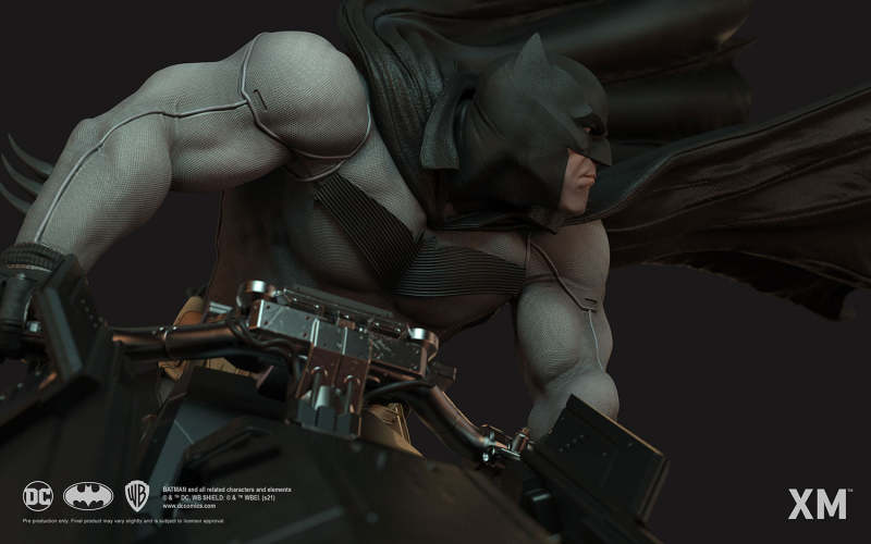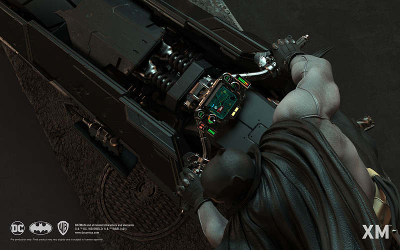 本作是由 XM Studios 與創作《蝙蝠俠:白色騎士》的漫畫家 Sean Murphy 攜手打造,長度來到驚人的 111.8 公分,整體展現出騎著蝙蝠機車的蝙蝠俠在道路上急煞調頭的場景,飛舞的披風、機車在地面上畫出的胎痕有著強烈速度感,蝙蝠俠本體考究地還原漫畫設定的蝙蝠裝,並形塑出寫實的肌肉線條,蝙蝠機車的部分更是令人興奮!除了再現其獨特、俐落的線條,與彈孔、刮痕這些戰損處理之外,還能藉著拆下前蓋、欣賞到漫畫中看不到的內裝機構,驚喜滿載!