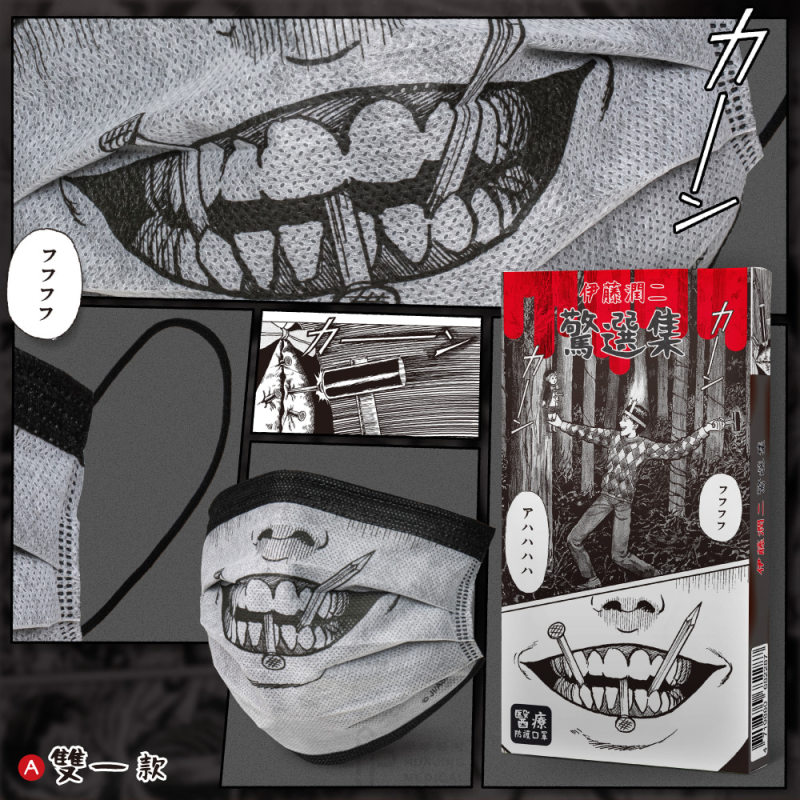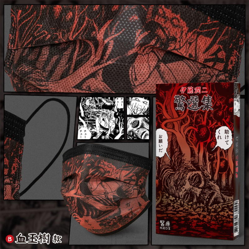 這次的「伊藤潤二聯名醫療口罩」一共推出三種款式,分別是伊藤潤二老師筆下的超人氣角色「富江」、「雙一」,以及著名故事之一「血玉樹」的主題造型,「雙一款」直接展現出他最為招牌的「嘴含鐵釘」特色,讓各位玩具人想學雙一不用辛苦含鐵釘,戴上口罩立刻又怪又陰森,散發雙一式的胡鬧魅力,「富江畫家款」是以《畫家》故事中,雕刻家「岩田」所打造、散落滿地的富江雕像碎塊的圖案為題製作,「血玉樹」則是將嗜血孩童散發的獵奇恐懼完整表現。