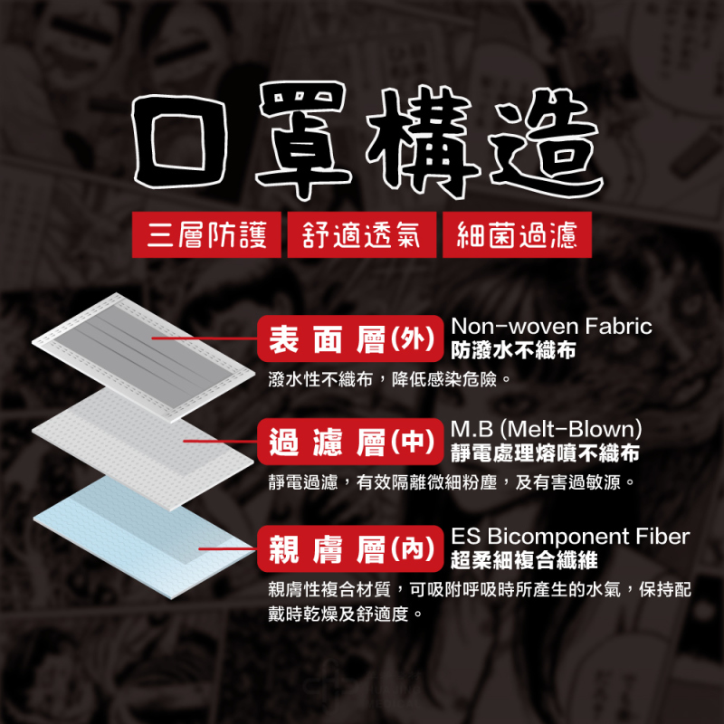 除了令人腦洞大開的口罩圖面,這次採一封 10 入的口罩包裝盒也有滿滿的設計巧思,印製了《伊藤潤二驚選集》的 LOGO 與相對應的章節封面;既然是口罩,當然也要提一下功能囉!三層防護的構造同時加強細菌過濾與穿戴時的舒適性,最表層也是採用防潑水不織布,推薦給喜歡伊藤潤二老師的玩具人啦。