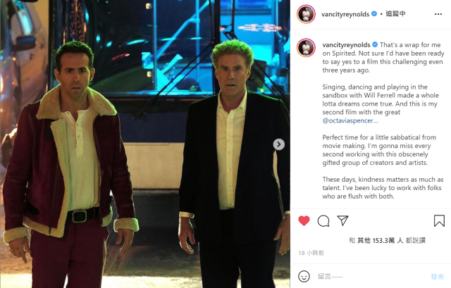 有趣的是,看到老公這篇殺青文的布蕾克萊芙莉(Blake Lively),馬上就在貼文底下留言:「米高肯恩搶先你一步了!」搞笑調侃老公的休假決定。除了老婆布萊克,亦有參演《Spirited》的奧塔薇亞史班瑟(Octavia Spencer)也留言祝萊恩休假愉快:「你是一位出色的演員、歌手和製片人(萊恩是《Spirited》監製之一)。 我和你、威爾、還有這群優秀的卡司和劇組人員一起度過了很棒的時光! 盡情享受您的休息時間吧。」