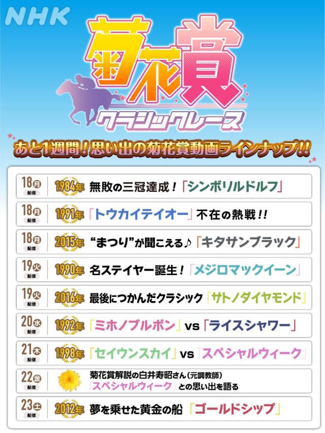 NHK大阪放送局(@nhk_osaka_JOBK)在10月17日發布一篇推文,附圖是他們將在10月18日~23日這一週中每天播出過去的菊花賞比賽實況,沒錯,10月24日將會是賽馬「經典三冠」最終戰菊花賞舉辦的日子,為此NHK想藉著今年的比賽開始前讓大家回顧過去一些經典的菊花賞賽事。不過重新看一下圖片,菊花賞的LOGO造型不就是「賽馬娘」的作品LOGO嗎!?