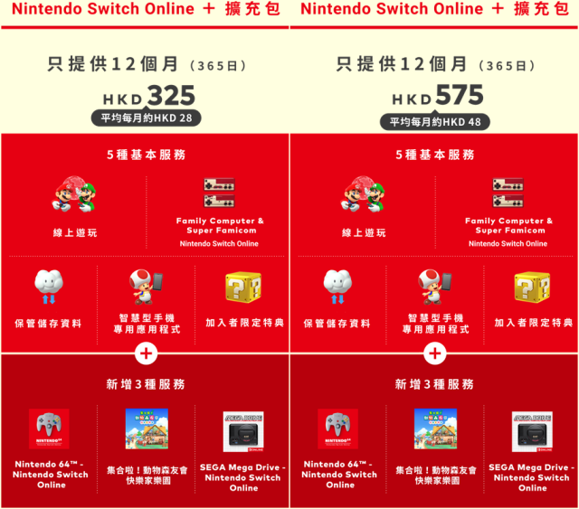 至於「Nintendo Switch Online + 擴充包」付費服務,個人方案僅提供年費4900日圓(約新台幣1200元左右);而兩人以上的家庭方案則是8900日圓(約新台幣2100元左右)。