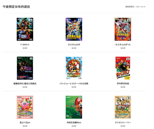 繼先前直播發表會所釋出的Nintendo 64與Mega Drive經典遊戲陣容後,此次N64的部分也追加收錄了《薩爾達傳說:穆修拉的面具》、《阿邦阿卡大冒險》、《瑪利歐高爾夫64》、《星之卡比64》、《F-ZERO X》、《寶可夢隨樂拍》、《瑪利歐冒險記》、《組合機器人》、《組合機器人V2》等作品。