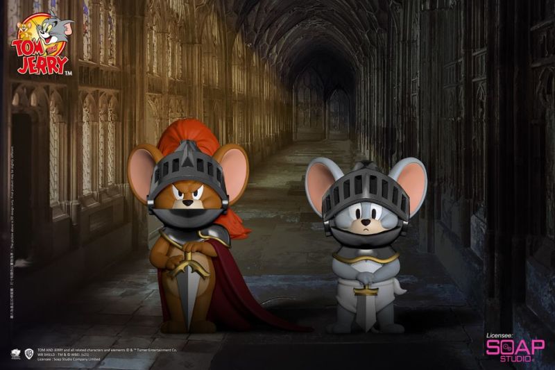 本次以中世紀歐洲皇家風格所重新詮釋的《湯姆貓與傑利鼠》新作,同步發行了高約 30 公分的「國王湯姆貓」與高度 15 公分的「騎士傑利鼠&騎士泰菲」,國王湯姆貓展現出不可一世的驕傲模樣,頭戴金色王冠、身披柔軟斗篷,慵懶地坐在鑲有紅寶石的金色座椅上頭,正以高高在上的眼神凝視著前方,有種已經嚐遍世界山珍海味、體驗過各式浮華,對任何事都不感興趣的帝王感。