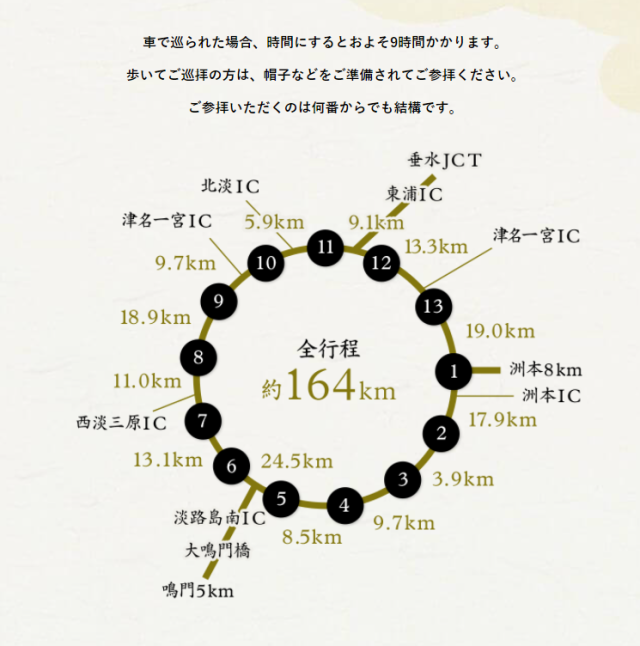 根據十三佛寺巡禮官網所表示,此次的環島活動起點從千光寺出發,一路騎到八幡寺,總里程約長達164公里,車程總花費時間則是約達9個小時,民眾可以在這一趟自行車公路中,不僅能因為追隨佛祖的步伐得到心靈上的平靜,同時還能欣賞大阪與淡路島之間的大阪灣,將周遭的美麗風景通通盡收眼底。
