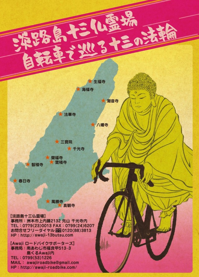 而除了一般民眾的惡搞創作外,事實上這幾年連佛寺、廟宇自身也掀起了一股相當有趣的創意宣傳,讓宗教傳遞不再有距離感,反而是更添加了一份令人開心滿懷的親民感。例如近日位於日本兵庫縣淡路島,為了紀念淡路島十三佛寺聖地40周年,就有共達13間的佛寺特別發起了自行車公路之旅,來邀請民眾共襄盛舉。