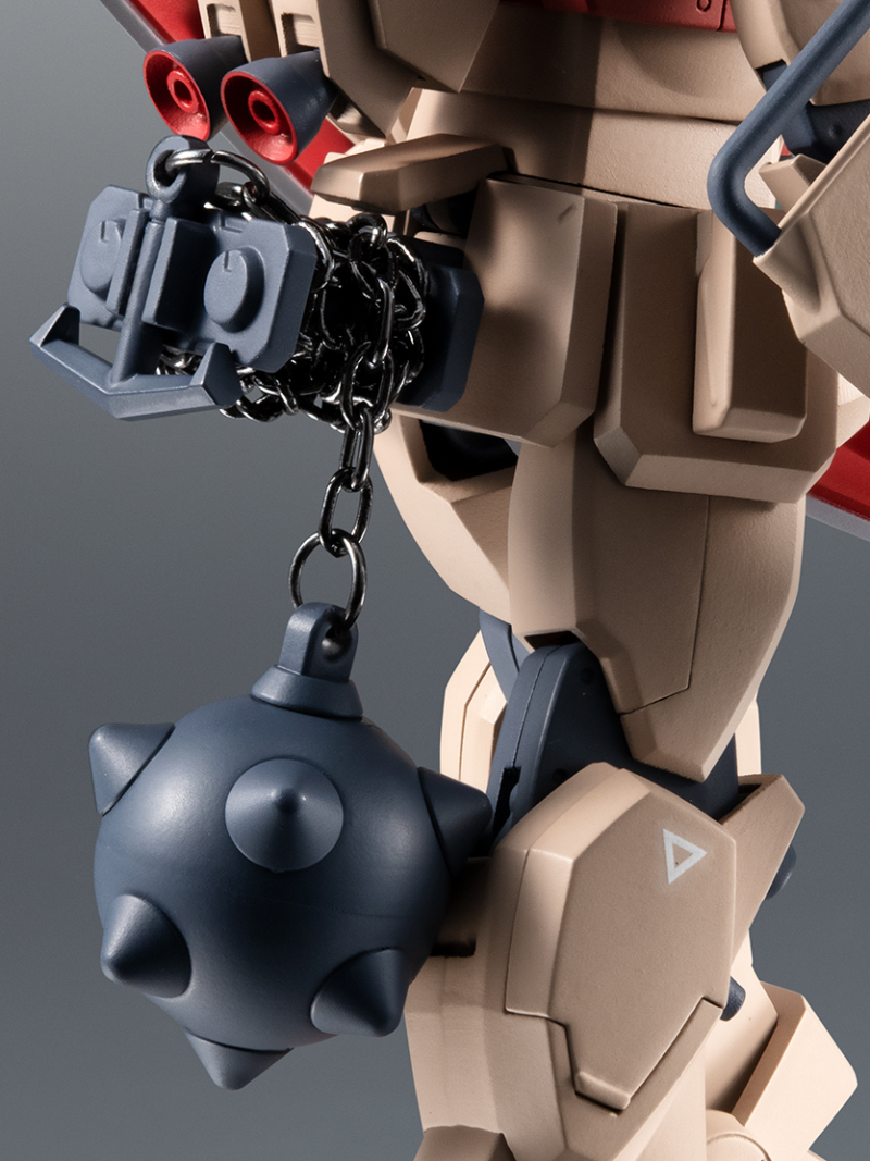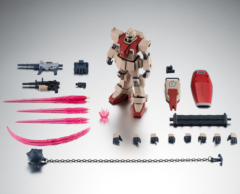 豐富的武裝配件包含光束步槍、超絕流星鎚、100mm機槍、一般盾牌、再現第07MS小隊所屬機的短型盾牌,以及光束軍刀刀身、光束步槍射擊特效等零件,藉由專用的連接零件就能將各種武裝懸掛機體後方。