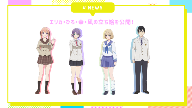 聲優部分,先前確定動畫時就已公開男主角「海野凪」與女主角「天野繪里香」分別由石川界人和鬼頭明里來配音。而後續公布的瀨川彌(瀬川 ひろ) 則為東山奈央來配音,而男主角的妹妹-海野幸尚未公開配音的聲優,官方也公布了動畫的人物立繪。
