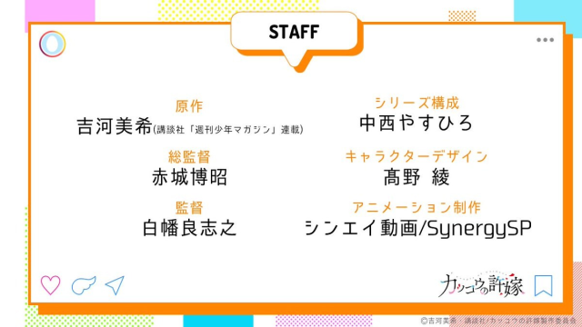製作團隊部分,作品總監督為先前負責動畫《擅長捉弄人的高木同學》&《戰鬥員派遣中!》監督工作的赤城博昭;監督為白幡良志之,動畫則由製作《擅長捉弄人的高木同學》&《天竺鼠車車》的シンエイ動画以及今年 7 月新番《急戰5秒殊死鬥》製作的 SynergySP 兩方協力製作。