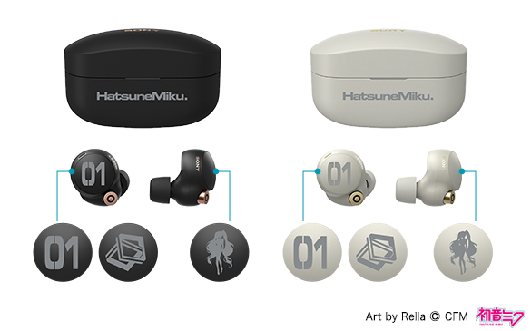 本次聯名造型上,專屬的充電盒有著「HatsuneMiku」的字樣驗明正身,耳機本體其中一耳印有「全身剪影」,另一耳則可以選擇「數字」與「髮飾」兩個款式,顯示出初音的特色。