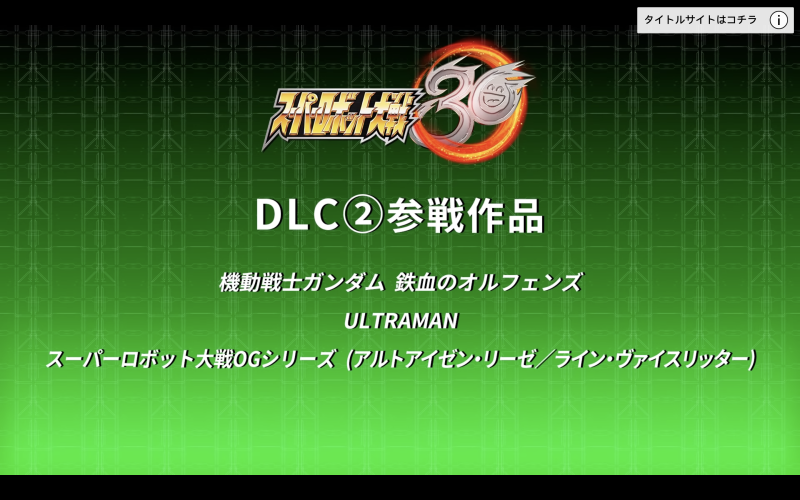 備受許多粉絲關注的《超級機器人大戰30》即將於2021年10月28日發售,在發售日即將到來之際,BANDAI NAMCO又公布了第二波DLC的內容,包括包含《機動戰士鋼彈 鐵血孤兒》、《ULTRAMAN 超人力霸王》,以及OG原創系列的「古鐵巨人」(アルトアイゼン・リーゼ)與「純白騎士」(ライン・ヴァイスリッター)。總共有三部作品,九架機體參戰。DLC第二波將於2021年12月發放。