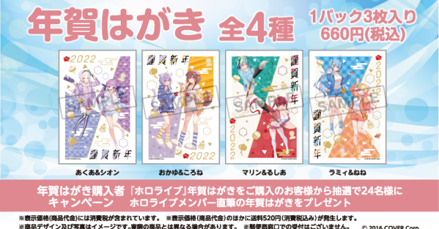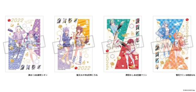 這次合作上,以《hololive》旗下二期生-「湊あくあ」&「紫咲シオン」、Gamer 的「猫又おかゆ」&「戌神ころね」、三期生的「潤羽るしあ」&「宝鐘マリン」 以及五期生的「雪花ラミィ」&「桃鈴ねね」為宣傳擔當,明信片組以這四組搭檔為插圖,各別穿上正月的休閒服裝來跟大家拜年啦 !