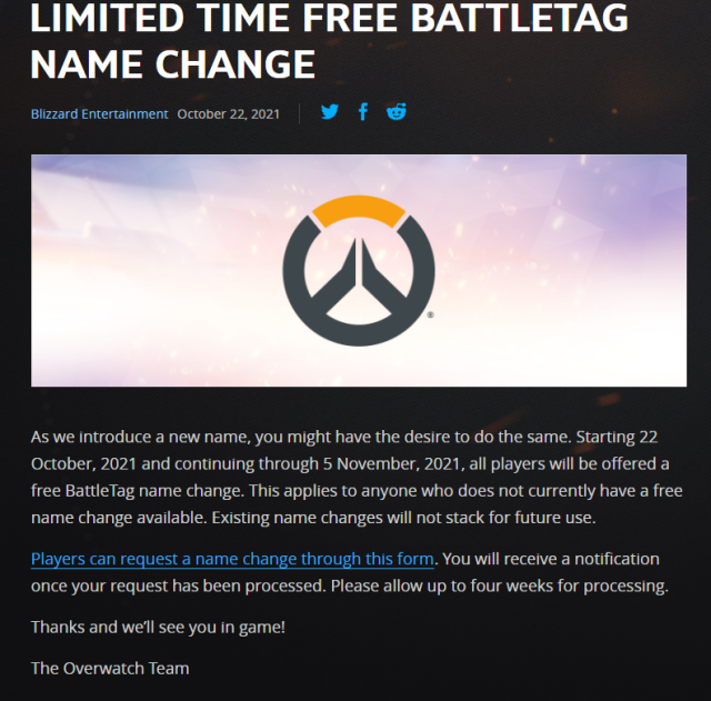或許是因為考量到也有玩家想趁這個時候也想修改自己BattleTag的名稱,暴雪官方日前宣布,將從2021年10月23日起到2021年11月6日止,從原先的付費300元新台幣改名,改為限時免費更名活動。暴雪強調,只要是目前為止沒有使用過免費BattleTag變更次數的玩家,都可以享有這項福利。