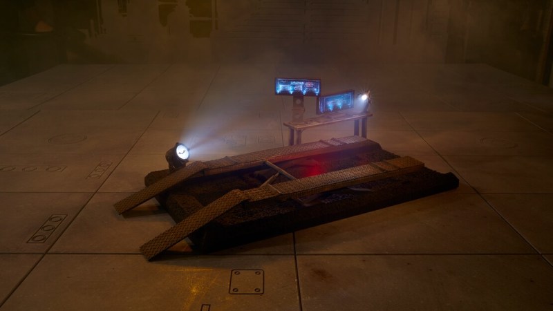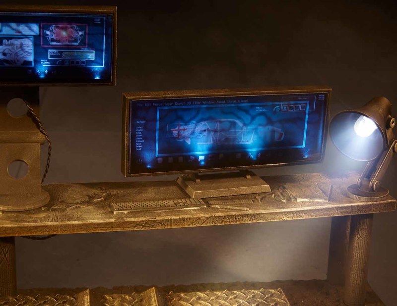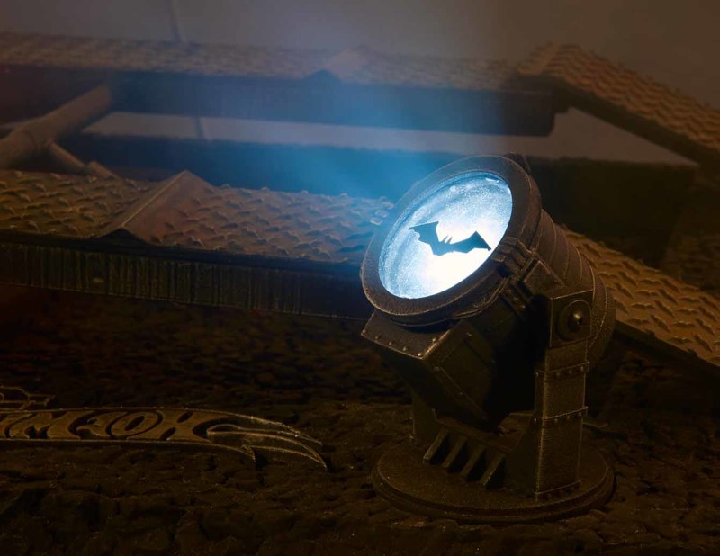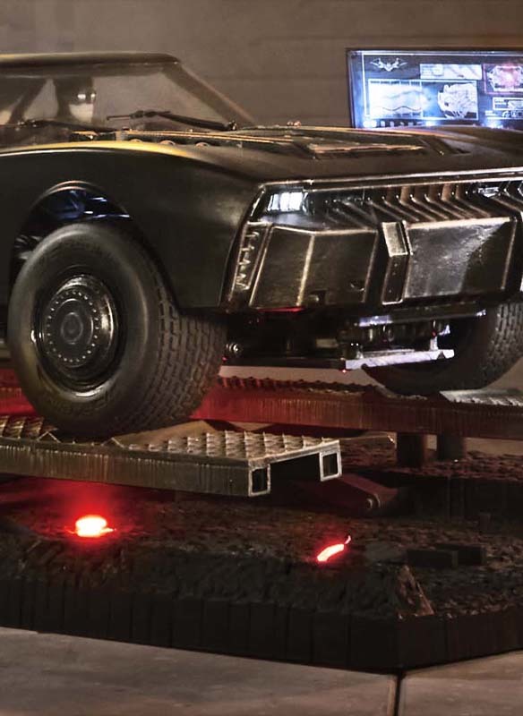 ▼除了車體本身,附有蝙蝠洞的工作懸架,另配有電腦螢幕和經典蝙蝠燈等科技設備!