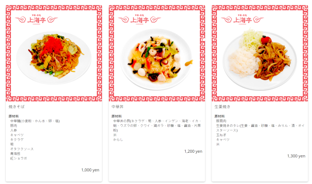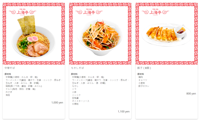 主食餐點部分,以中華拉麵、燒餃子、炒麵、中華丼 ( 燴飯 )、生薑豬肉飯為主。
