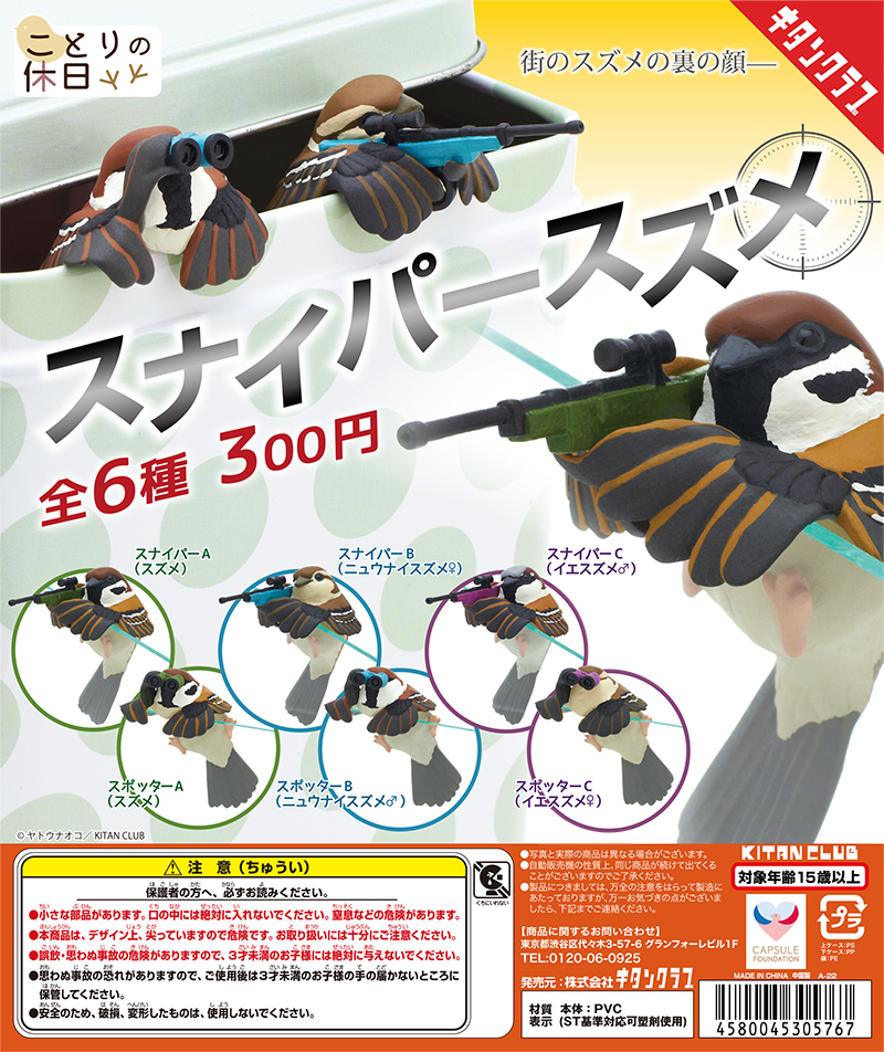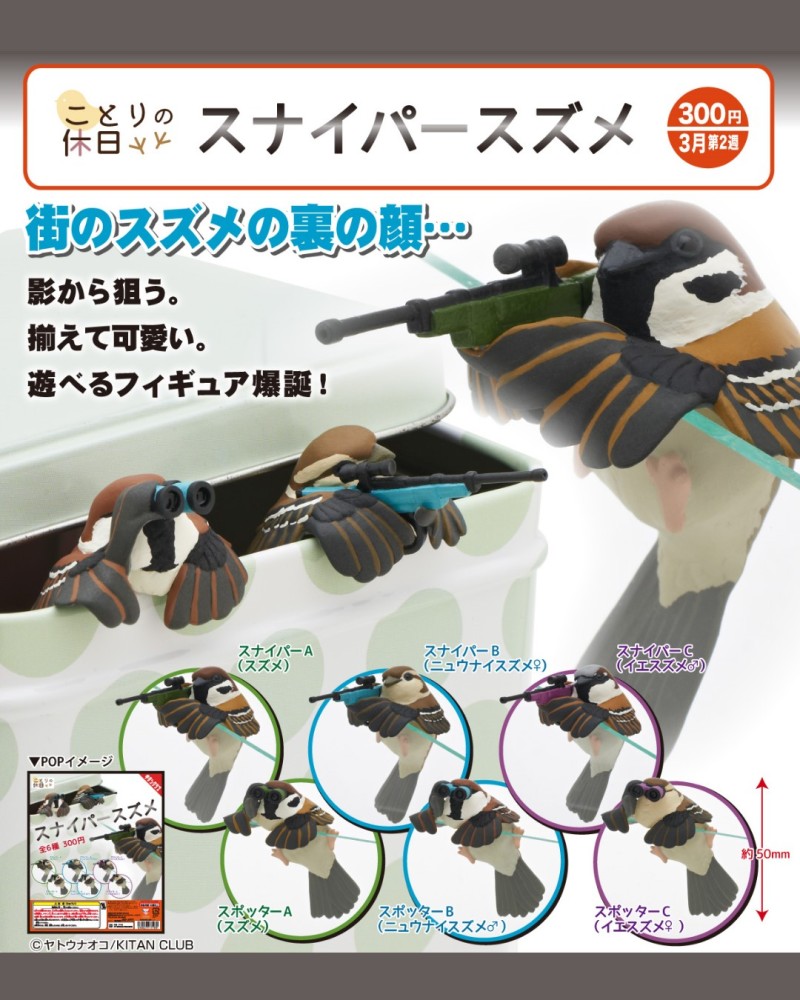 日本轉蛋玩具廠牌奇譚俱樂部(KITAN CLUB)攜手日本設計師 ヤトウナオコ(@yatou36)在推出「小鳥的假期(ことりの休日)」系列第一彈「泳圈麻雀」之後,又將於 2022 年 3 月發售續篇轉蛋新作「狙擊麻雀」(スナイパースズメ)!