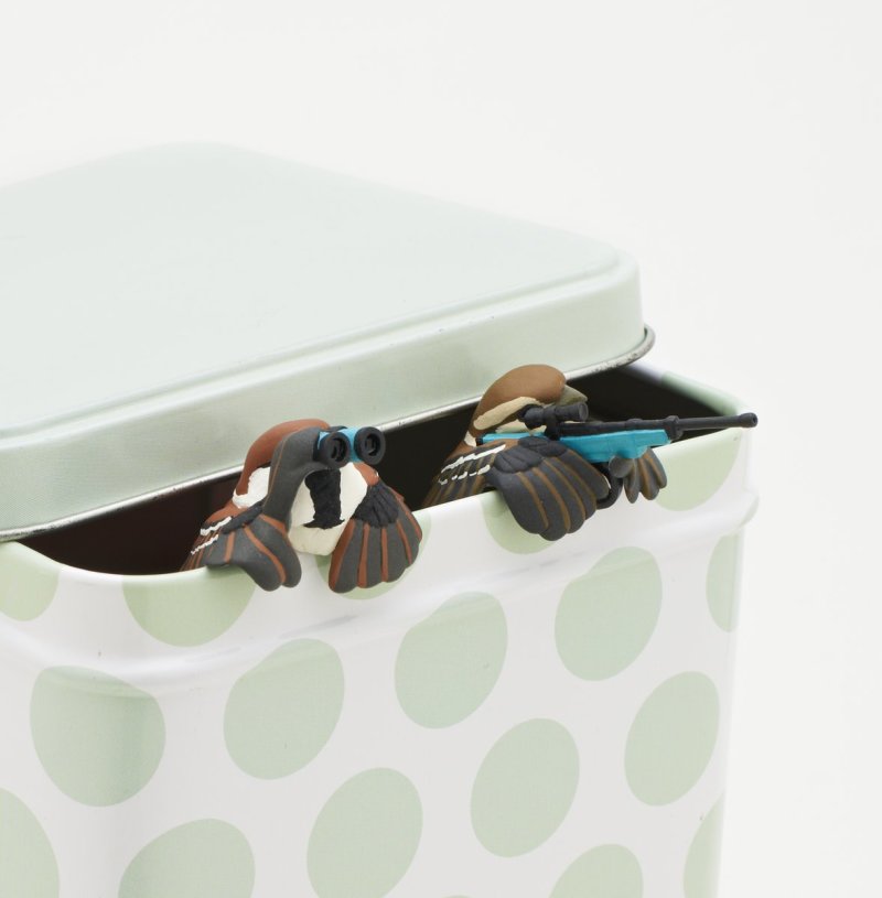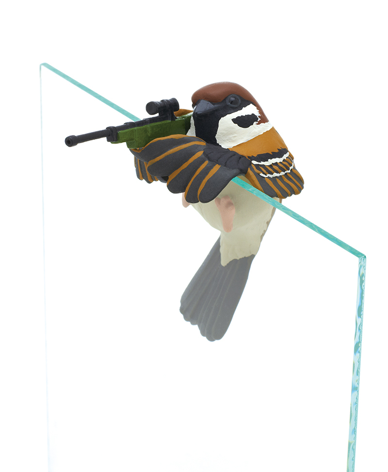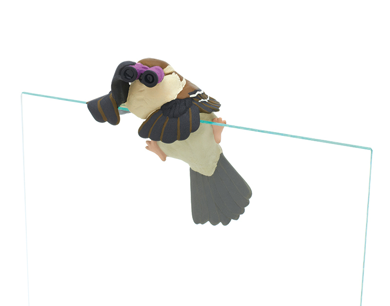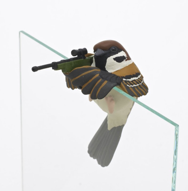本作在約 5 公分的尺寸中製作出擬人化麻雀的身體細節,以及褐白黑色為主調的羽毛,小小的鳥腳實在太萌!不管是拿著狙擊槍還是握著望遠鏡的造型都給人超腹黑的爆笑效果,藏在桌上各個角落、再搭配其它轉蛋玩具就能呈現出超級不妙的場面,這要包套啊!